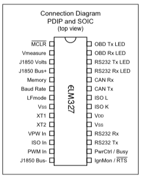 I’ve highlighted some of the more used ones. Mode 09 pulls vehicle information, like the manufacturer of the car, the Vehicle Identification Number (VIN), and other information that doesn’t change. Mode 03 is used to pull any stored trouble codes — these may or may not be causing the MIL to light up. Depending on the code, one or two might just be stored without lighting up the MIL. Mode 01 is full of great real time information like the engine’s current RPM, the current speed, the throttle position, coolant temperature, intake temperature, and all sorts of other sensor information. First off, you’ll want to plug the Bluetooth OBD-II adpater into this port and turn the car on. The Bluetooth adapter uses an ELM327 chip to communicate with the CAN bus over OBD-II. The ELM327 chip is a programmed microcontroller produced by ELM Electronics for translating the OBD interface. The ELM327 command protocol is one of the most popular PC to OBD interface standards, it’s the best way to communicate with the CAN bus over OBD-II.